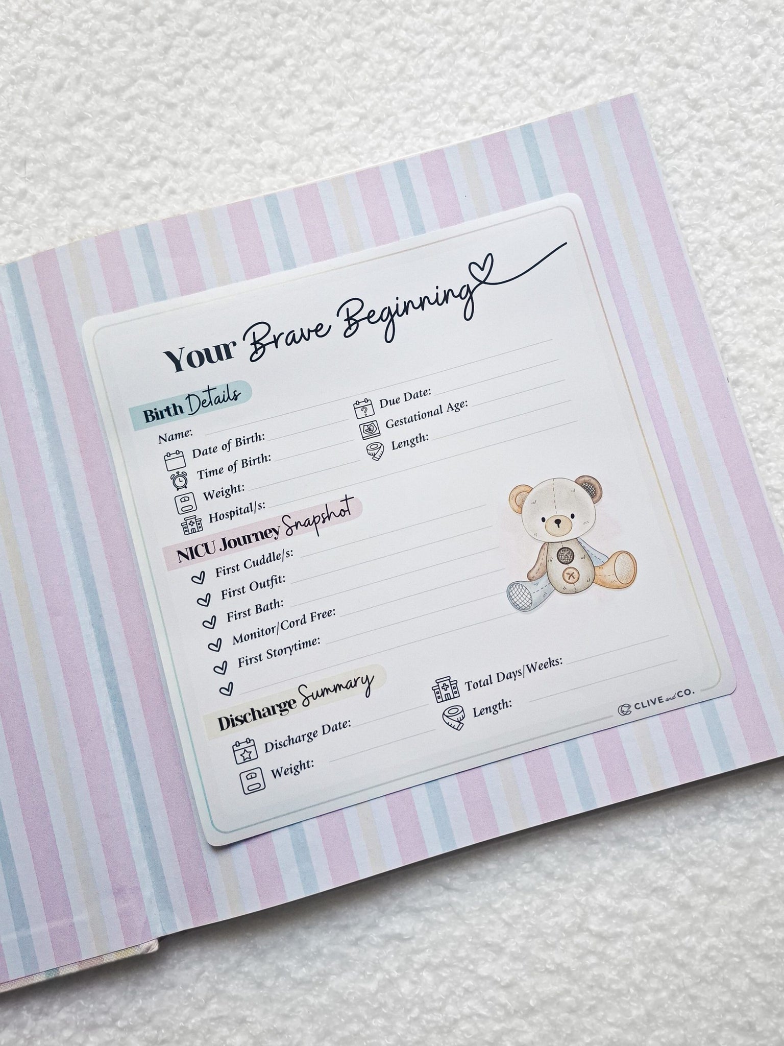 Thoughtfully crafted for NICU parents and carers, the sticker adheres neatly to the inside endpapers of your book. It includes prompts for birth information as well as NICU-specific moments such as: